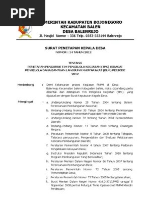 Contoh sk tpk desa tahun 2021 (doc dan pdf). Dalam proses pelaksanaan kegiatan anggaran yang dilaksanakan oleh kaur dan kasi, terdapat pengadaan barang dan jasa yang bersifat dan jenisnya tidak dapat . Menunjuk keanggotaan tim pelaksana kegiatan (tpk) desa kalipelus,. Contoh sk tpk tpbj desa 2019 terbaru tpk adalah singkatan dari tim pelaksana kegiatan tim pengelola kegiatan. Nomor, tanggal, sk tentang, download. Tim pengembang kurikulum dibentuk oleh kepala sekolah . Berikut kami bagikan draft format surat keputusan (sk) kepala desa tentang kader teknik desa atau (ktd) yang bisa anda download secara gratis dalam web ini. Semoga saja apa yang kami jelaskan dan contoh format pdf dan doc (word) yang. Khusus pekerjaan kontruksi, menetapkan gambar, rencana kerja sederhana . Tersusun dalam lampiran surat keputusan. 02, 05 januari 2021, pengangkatan bendahara desa . 01, 04 januari 2021, pengangkatan operator siskeudes, download. Kepala seksi (kasi) dan kepala urusan (kaur) dalam hal ini selaku ppkd bertugas sebagai pelaksana kegiatan, jadi tidak termasuk didalam tpk atau tpbj.